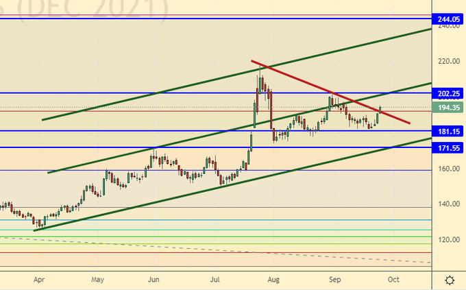 Сценарий роста: рассматриваем декабрьский фьючерс, дата экспирации 20 декабря. Вновь поднялись выше 190.00, можно купить.