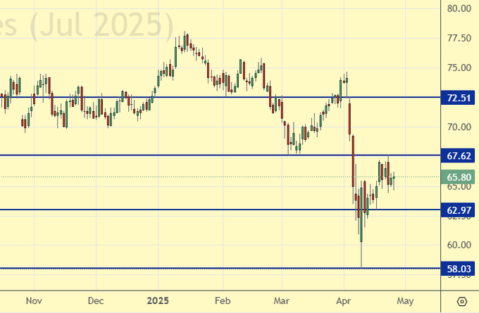 Настроения ряда членов картеля остаются воинственными с точки зрения их желания нарастить добычу и выйти из соглашения. Из-за новых пошлин Трампа наверняка часть государств, в том числе и экспортеров нефти, получит более скромные поступления валюты в перспективе, что приведет к проблемам по сведению бюджета. Это может провоцировать желание нарастить добычу и закрыть дыру. Для всех экспортеров нефти демарши отдельных стран и бесконтрольное наращивание добычи могут дорого обойтись. Цена упадет.