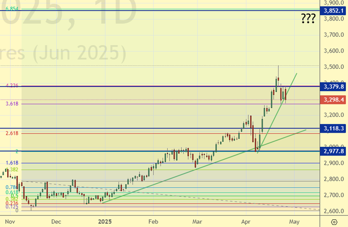 Сценарий роста: рассматриваем июньский фьючерс, дата экспирации 26 июня. Из-за конфликта Индии и Пакистана золото может продолжить ралли. В мире лучше не становится.