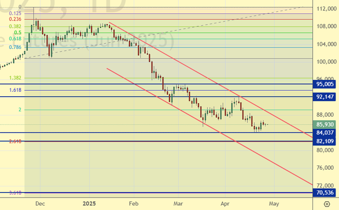Сценарий роста: рассматриваем июньский фьючерс, дата экспирации 19 июня. От 82250 покупать однозначно. Пока есть шансы на касание данной отметки. В случае роста выше 88000 таких шансов будет намного меньше.