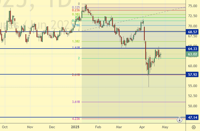 Сценарий роста: перешли на июньский фьючерс, дата экспирации 29 мая. Сложно прогнозировать. Слишком много политики. Глобально о бычьем рынке стоит думать только после роста выше 75.00.