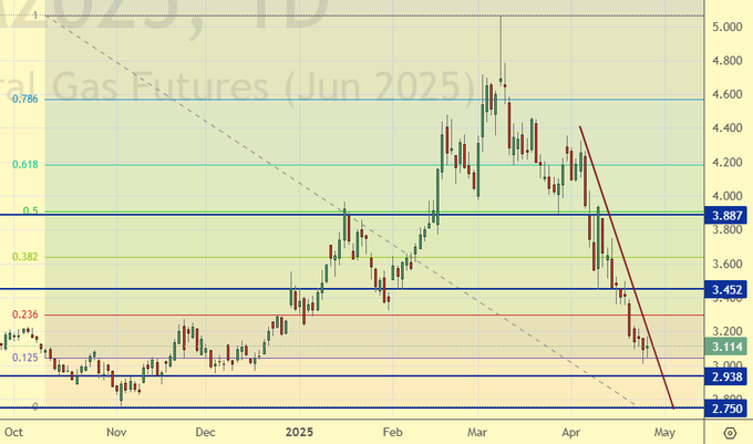 Сценарий роста: перешли на июньский фьючерс, дата экспирации 28 мая. Здесь можно покупать. Хранилища газа в Европе пусты.