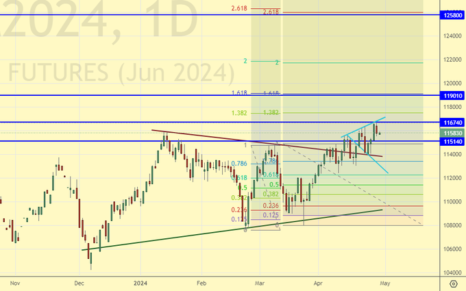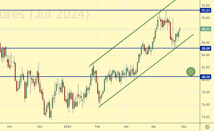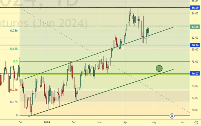 Сценарий роста: рассматриваем майский фьючерс, дата экспирации 31 мая. Покупки не делаем. Ждем откат к 81.00. А потом можно и 120.00.