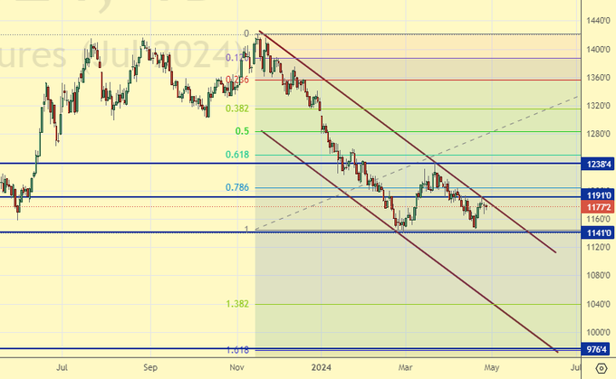 Сценарий роста: перешли на июльский фьючерс, дата экспирации 12 июля. Как и ранее, очень у нас слабые надежды на продолжение роста. Перспективы по кукурузе хорошие несмотря на сокращение площадей в США. Ход вверх может состояться только на срыве стоп-ордеров продавцов.
