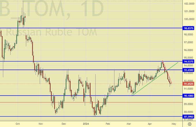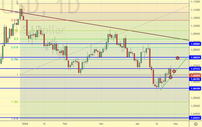 Сценарий падения: держим шорт. При этом понимаем, что всплеск к 1.0800 возможен в среду 1-го мая. Заседание ФРС.