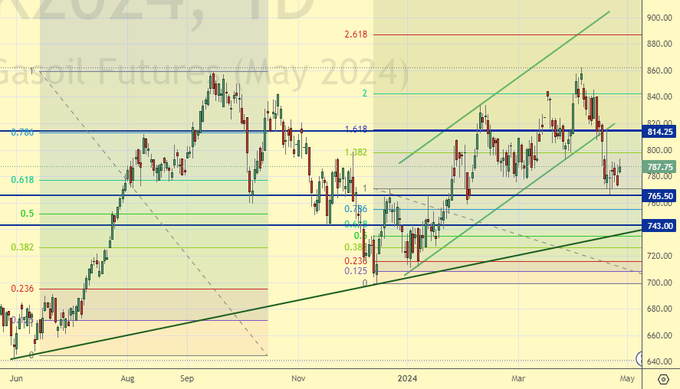 Сценарий роста: рассматриваем майский фьючерс, дата экспирации 10 мая. Можно купить и сейчас. Мы же будем держать открытый ранее лонг. От 743.00, конечно, интереснее, но и эти уровни для покупок можно считать рабочими.