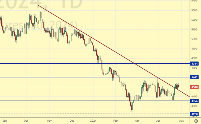 Покупка: нет. Кто в позиции от 442.0 (с учетом перехода на новый контракт), перенесите стоп на 432.0. Цель: 500.0.