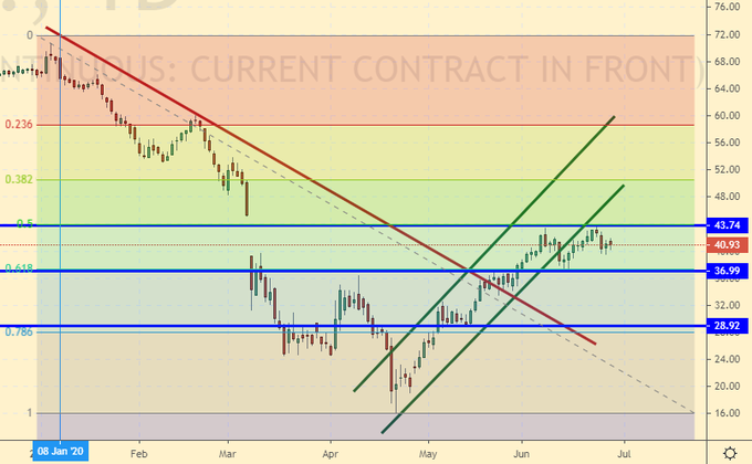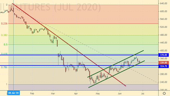 Сценарий роста: рассматриваем июльский фьючерс, дата экспирации 10 июля. Быкам надо держать уровень 340.0, в противном случае цены выйдут из растущего канала и возникнет угроза возврата к 250.0. Если здесь покупать, то только на часовых интервалах.
