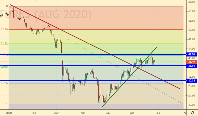 Сценарий падения: здесь надо пытаться продавать. Если перед нами неудача быков и хода к 45.00 мы так и не увидим, то есть большая вероятность, что рынок вернется в район 30.00 причем быстро.