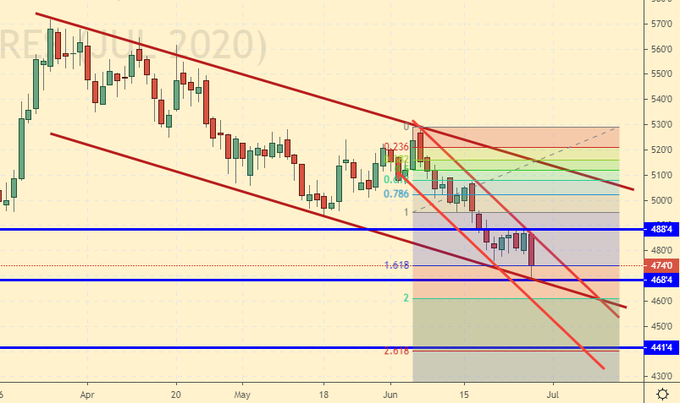 Сценарий роста: рассматриваем июльский фьючерс, дата экспирации 14 июля. Медведи полностью контролируют рынок. В пятницу показан новый минимум. Характер свечи таков, что говорить о развороте вверх пока не можем. Уровень 440.0 крайне привлекателен для покупок.
