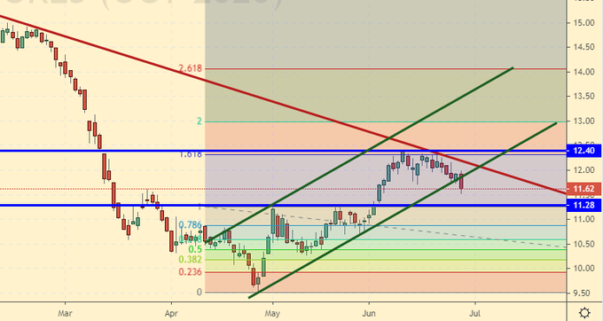 Сценарий падения: перекладываемся в октябрьский фьючерс. В июльском цены в понедельник закрывались ниже 12.00, что должно было вас втянуть в продажу по нашей рекомендации. Будем держать данный шорт. В случае возврата к 12.00 можно продать.
