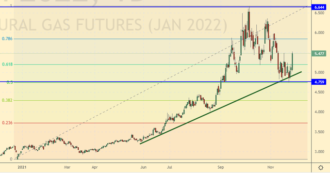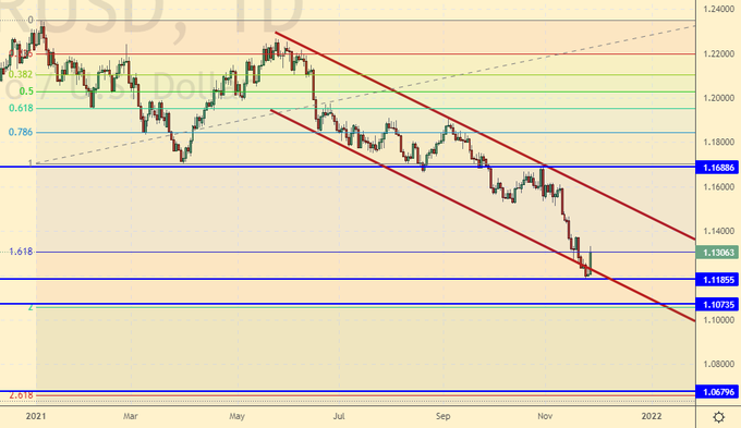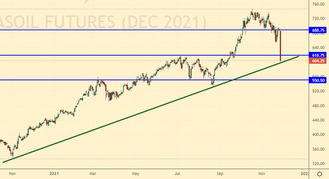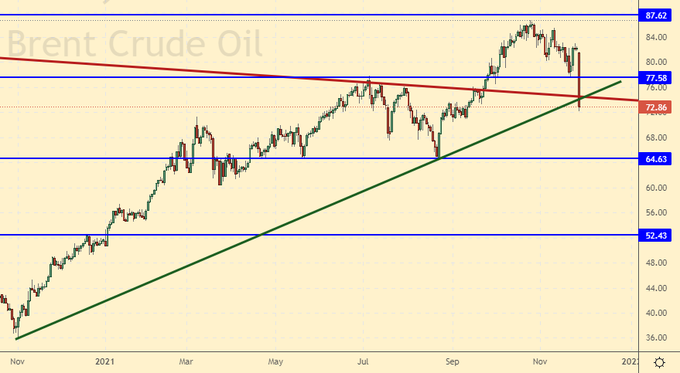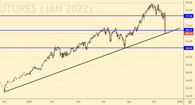 Как все видели, в пятницу нефть совершила попытку суицида и ушла за сутки на 10 долларов вниз. Если на следующей неделе в четверг 2-го декабря страны ОПЕК+ не приостановят наращивание добычи, Brent на 60.00 будет очень скоро. Если сократят предложение на рынке, всё равно мы пойдем вниз, просто не так быстро. Стоит отметить, что если страх перед новым штаммом вируса парализует разум, то мы, как и год назад, вновь можем увидеть дикую грусть в глазах экспортеров нефти.