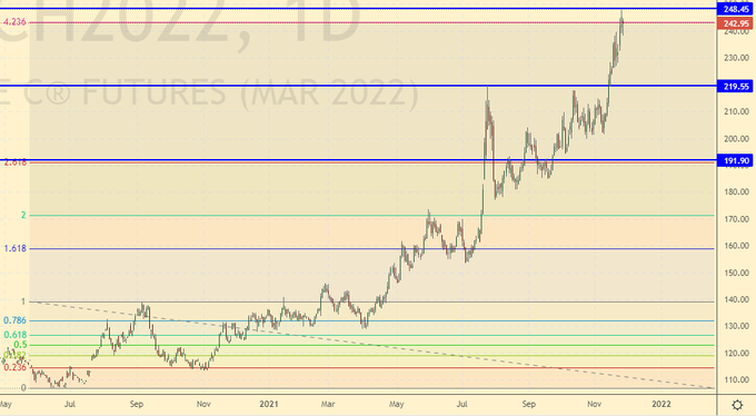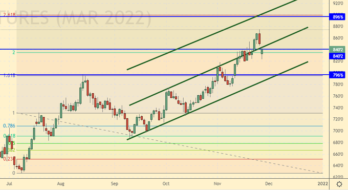 Сценарий роста: рассматриваем январский фьючерс, дата экспирации 14 января. Рынок держится выше 1250.0. Здесь можно покупать. Не исключено, что очередные карантины усилят спрос на масличные.