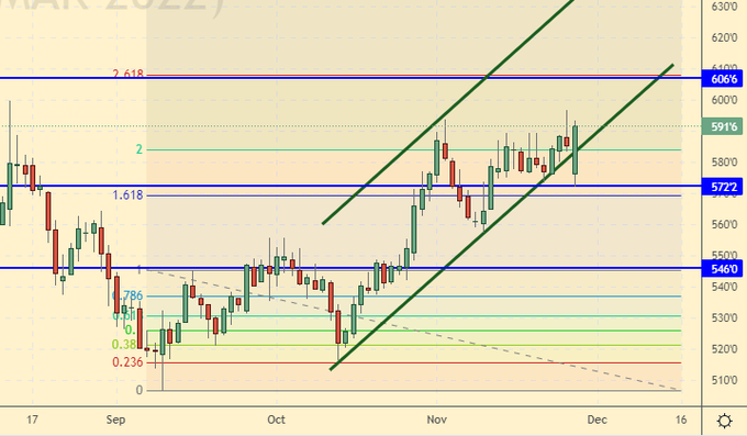 Сценарий роста: рассматриваем мартовский фьючерс, дата экспирации 14 марта. Продолжаем держать лонги с целью на 600.0. Кукуруза смотрится сильно после роста в пятницу.