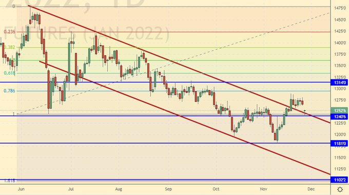 Сценарий роста: рассматриваем декабрьский фьючерс, дата экспирации 16 декабря. Мы продолжаем отказываться от покупок. При подходе к 150000 желающие могут войти в лонг, но больших надежд питать не стоит. Не исключено, что пятница 26-го ноября была лишь предтечей, а вот понедельник предстанет перед нами во всей своей красной красе. И это касается не только российского рынка, но и мирового.