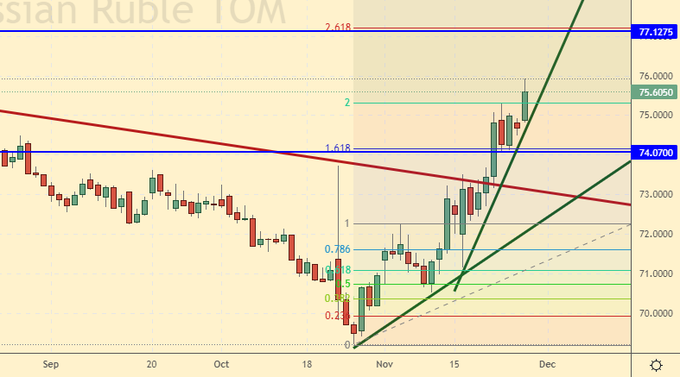 Честно говоря, от рубля мы ожидали большего. Сдача позиций против доллара в ноябре при цене нефти выше 80 долларов за бочку откровенно разочаровывает. Теперь, когда нефть пошла вниз, говорить о возврате к уровню 70.00, к сожалению, мы не можем. Рост доллара вновь разгонит инфляцию, Набиуллина вновь поднимет ставку и так по спирали.