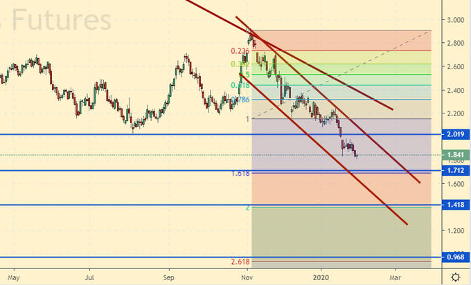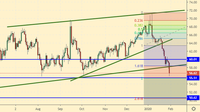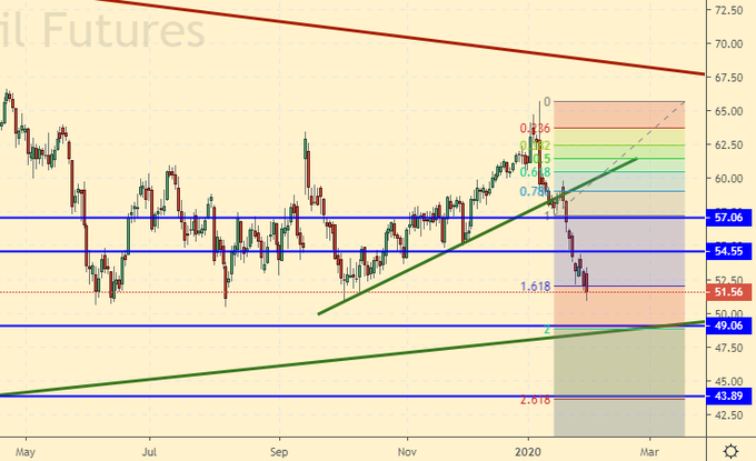 Падаем. Как и писали ранее, главы министерств энергетики будут проводить словесные интервенции с целями приостановить падение цен. Господин Новак был первым. Однако вряд ли кто-то будет обращать внимание на эти интервью, так как ситуация требует решений, а не пустых слов. Brent вполне способен достичь 50.00, на фоне вируса, а также на фоне несогласованности или инерционности действий экспортеров. Технически ситуация выглядит перепроданной, но раньше уровня 50.00 по Brent не стоит стремиться искать у рынка дно.