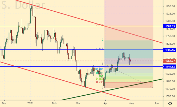 Сценарий роста: на фоне слабых комментариев Пауэлла 28-го апреля, сразу после заседания ФРС, говорить о силе доллара в ближайшие несколько месяцев не приходится. Поэтому, формирующийся восходящий тренд по золоту вполне уместен. Держим лонги.
