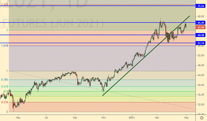 Сценарий роста: рассматриваем июньский фьючерс, дата экспирации 20 мая. В случае роста рынка выше 66.00 можно покупать на «часовках» с целями на 72.00. На дневных интервалах в лонг не входим. Нужен откат.