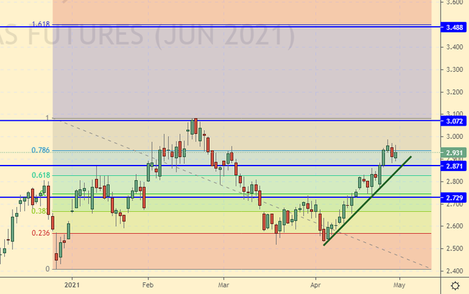 Сценарий роста: рассматриваем июньский фьючерс, дата экспирации 26 мая. Европа продолжает активно закупать газ у всех поставщиков, что будет еще долго поддерживать цены. Держим лонги.