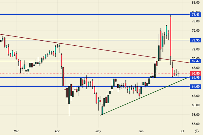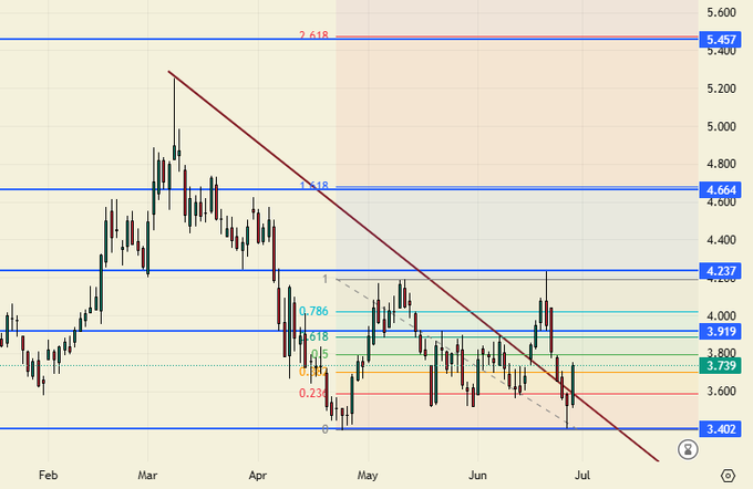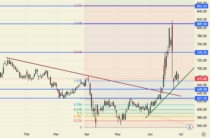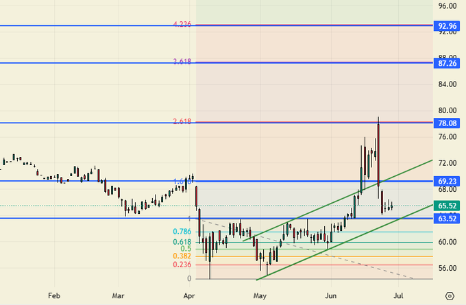Сценарий роста: рассматриваем сентябрьский контракт, дата экспирации 12 сентября. Драматичное падение из-за заключения перемирия (мира?) между Ираном и Израилем. Вне рынка.