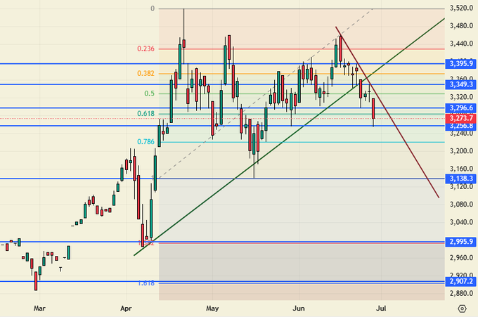 Сценарий роста: рассматриваем июльский фьючерс, дата экспирации 29 июля. Остановка обмена ударами на Ближнем Востоке спровоцировала падение золота. Хорошие уровни для покупок будут в районе 2900.