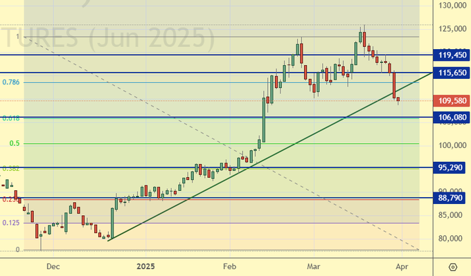 Продажа: нет. Кто в позиции от 117500, перенесите стоп на 117000. Цель: 89500.