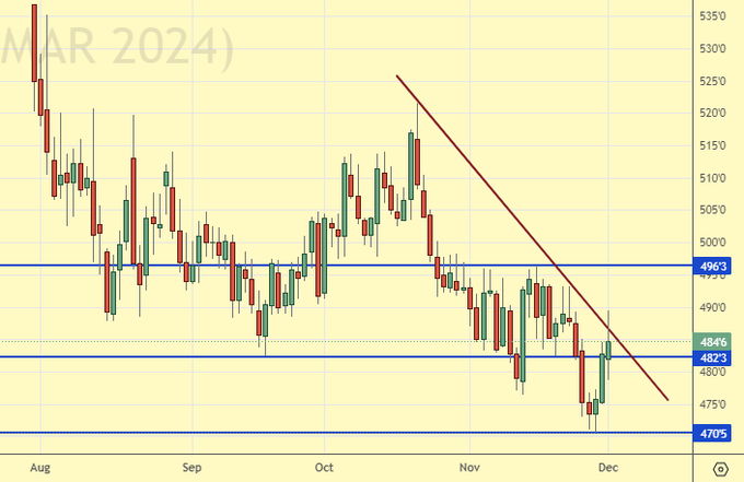 Сценарий падения: взяли 10 центов на декабрьском контракте, переходим на мартовский с целями на 425.0.