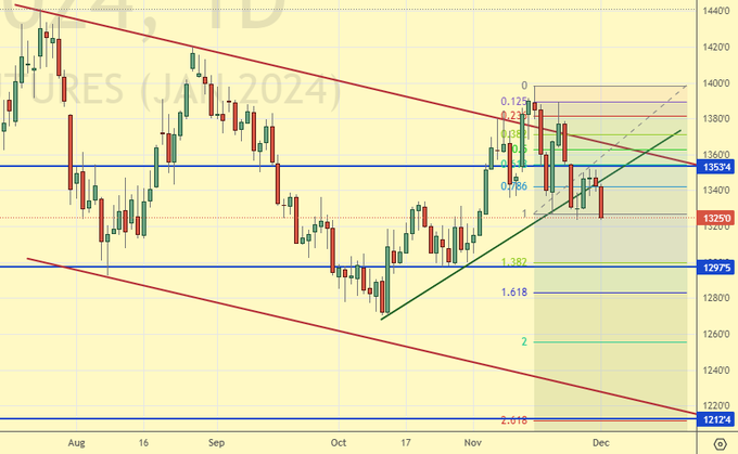 Сценарий роста: рассматриваем январский фьючерс, дата экспирации 19 декабря. Продолжим держать лонг со стопом на 71.00. Если позиция уцелеет, то у нее может быть хорошая перспектива.