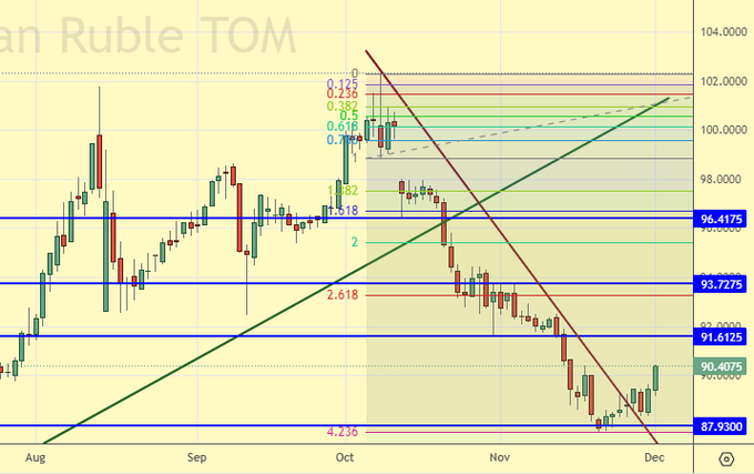 Сценарий роста: а вот не смогли мы пробиться ниже 88.00. Более того, мы еще и закрыли пятницу выше 90.00. Это может привести к ходу на 96.00.