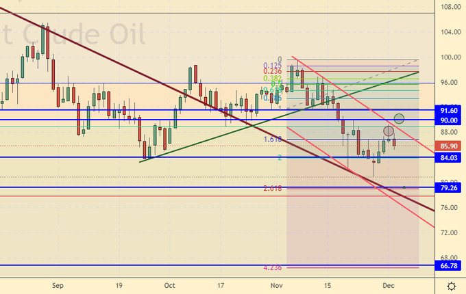 Сценарий роста: рассматриваем январский фьючерс, дата экспирации 20 декабря. Быки не смогли пройти выше 85.00, что говорит нам о том, что они не готовы взять контроль над рынком. С текущих уровней не покупаем, ждем падения.