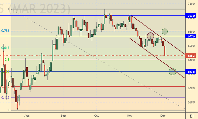 Продажа: нет. Кто в позиции от 670.0, перенесите стоп на 673.0. Цель: 500.0 центов за бушель. На уровне 630.0 можно закрыть 25% позиции.