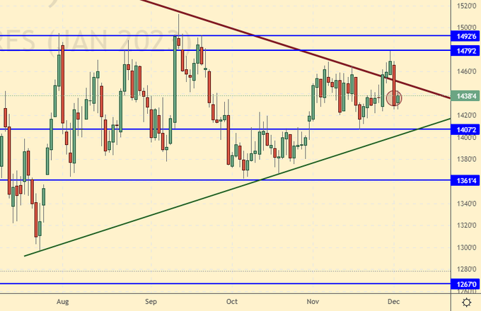 Сценарий роста: рассматриваем январский фьючерс, дата экспирации 13 января. Продолжим держать лонги от 1425.0. Новых позиций не открываем.
