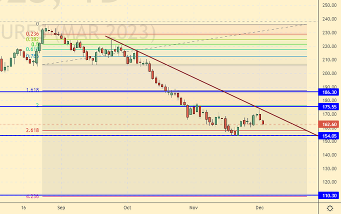 Покупка: нет. Кто в позиции от 160.0, 170.00 и 175.00, перенесите стоп на 158.00. Цель: 210.0 центов за фунт.