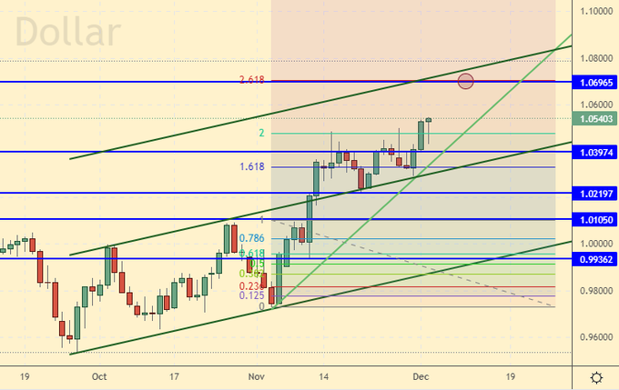 Сценарий роста: пошли мы прямо к 1.0700. 8-го декабря заседание ЕЦБ. Если не будет жестких решений пара откатит от 1.0700 обратно вниз. Не покупаем.