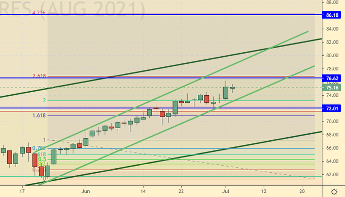 В целом рост спроса на нефть уже заложен в текущие цены. Коррекция назрела. Однако, если страны ОПЕК+ на переговорах не смогут найти устраивающего всех решения и отложат заседание на месяц, нефть марки Brent уйдет к отметке 80.00 долларов за баррель.