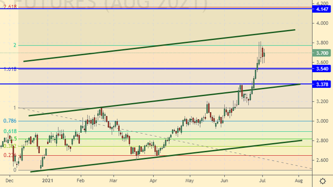 Сценарий роста: рассматриваем августовский фьючерс, дата экспирации 28 июля. Видим разворотную свечную формацию «высокие волны». Движение к 4.14 скорее всего будет отложено на некоторое время. Будем покупать на откате к 3.400.