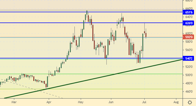 Сценарий роста: рассматриваем сентябрьский фьючерс, дата экспирации 14 сентября. Установившаяся жаркая погода может нагнать страху на трейдеров. Кукуруза пострадает не так сильно, как пшеница, но общее падение валового сбора зерновых поддержит цены на рынке и на кукурузу в том числе. Будем покупать при откате к 560.0.