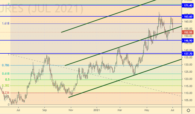 Сценарий роста: рассматриваем июльский фьючерс, дата экспирации 20 июля. Если лонг будет закрыт по стопу на 148.00, то в следующий раз будем покупать от 138.00. Пока держим открытые ранее позиции.