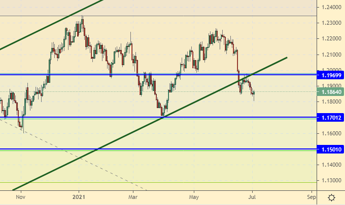 Сценарий падения: продолжим держать шорт. Ход к 1.1050 будет возможен если толпа поверит в усиление риторики ФРС 28-го июля. Сильные данные по рынку труда в США в июне могут заставить Пауэлла рассуждать о повышении ставки уже в первой половине 2022-го года.