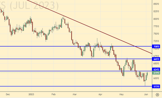 Сценарий роста: рассматриваем июльский фьючерс, дата экспирации 15 июля. Нашли уровень 1270 и отскочили от него вверх. Пока будем воздерживаться от покупок, так как прогнозы по сое очень уж хороши.