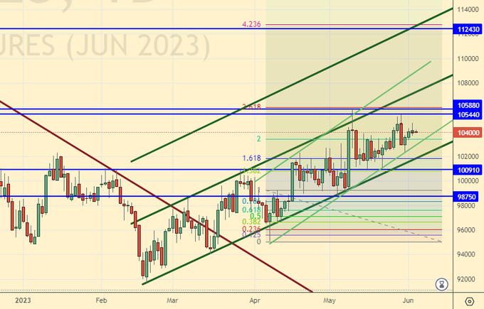Продажа: сейчас и при подходе к 106000. Стоп: 106700. Цель: 90000.