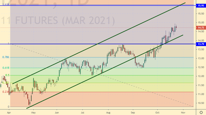 Сценарий роста: рассматриваем мартовский фьючерс, дата экспирации 26 февраля. Цены покинули растущий канал, а сейчас стремятся вернуться в него, но это будет крайне сложно сделать из-за агрессивного наклона прямых. Мы вряд ли сможем уйти выше 13.80. Пока не покупаем.
