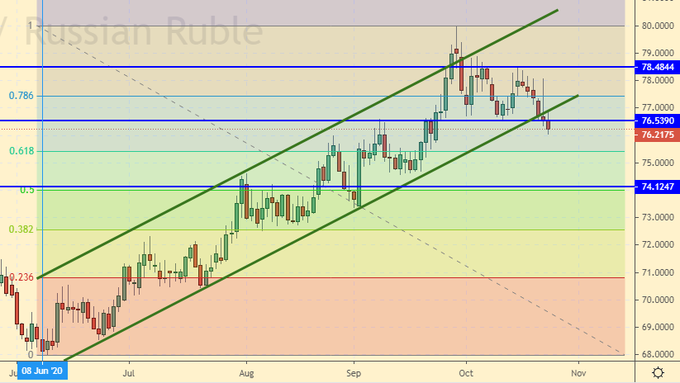 Сценарий падения: быков на неделе явно захлестнули эмоции. Мы резко прошли к 80.00, где, не исключено, ЦБ вышел на рынок с лотом, который охладил пыл покупателей. Коррекция к 76.00 возможна, но отрабатывать её лучше на часовых интервалах.