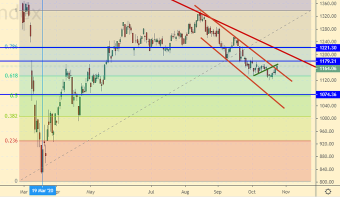 Сценарий роста: рынок нарисовал пятиволновой импульс вниз. Ждем подъема в район 1220, после чего должна последовать еще одна волна падения. Если коррекции вверх не будет, то мы просто свалимся к 1000. Пока не покупаем.