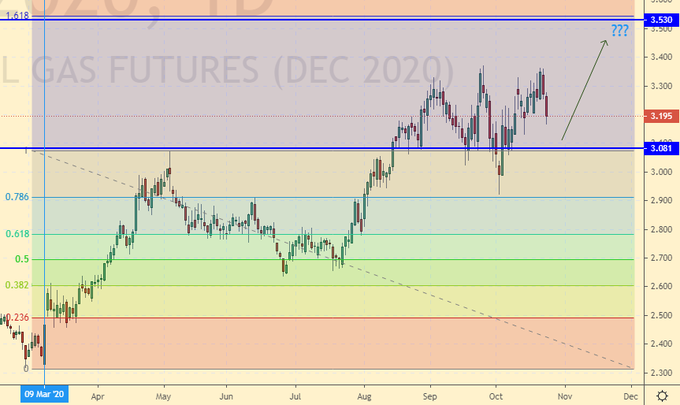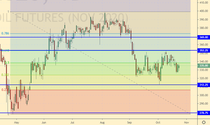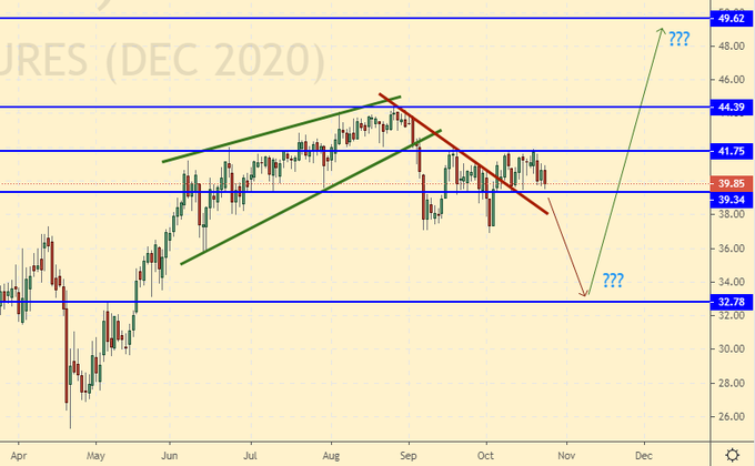 Сценарий роста: рассматриваем ноябрьский фьючерс, дата экспирации 20 октября. Если мы упадем к 32.00, то там стоит поискать возможности для входа в лонг. Вряд ли продавцы смогут пройти данный уровень до заседания техкомитета ОПЕК 15-го числа.