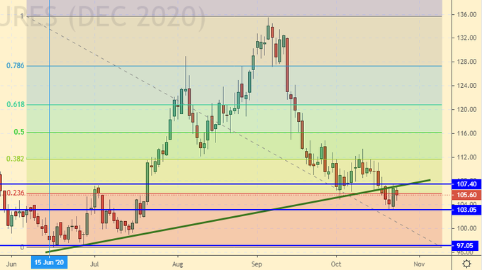 Сценарий роста: рассматриваем декабрьский фьючерс, дата экспирации 14 декабря. Со второй попытки зацепились за лонг от района 540.0. Несмотря на хороший рывок в среду, есть опасения, что мы не сможем подойти к 600.0. Три последовательно растущих максимума практически на одной линии не предвещают быкам ничего хорошего. Подтягиваем стоп-ордера. Ждем.