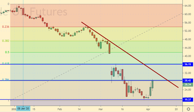 Сценарий роста: рассматриваем июньский фьючерс, дата экспирации 30 апреля. Можно было брать от 25.00 и закрываться на 34.00. Дальнейший рост воспринимаем как блеф. С учетом переноса совещания ОПЕК+ на вторую половину недели ждем охлаждения цен. В любом случае, рынок выше 39.00 не виден.