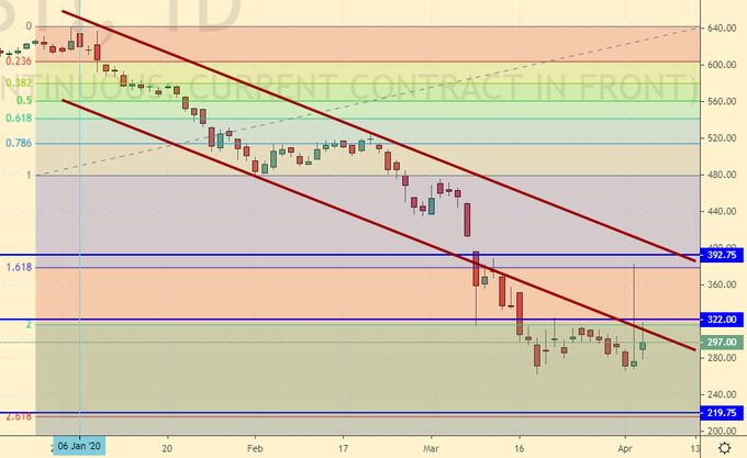 Сценарий роста: рассматриваем апрельский фьючерс, дата экспирации 8 апреля. Подъем к 400.0 возможен, но слишком много случайных факторов накануне возможной встречи ОПЕК+. Не покупаем.