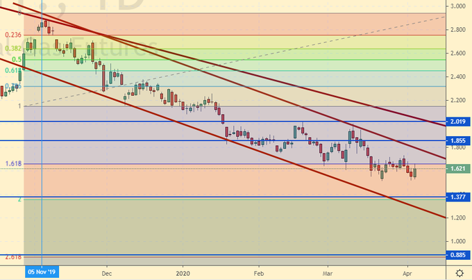 Сценарий роста: рассматриваем майский фьючерс с датой экспирации 28 апреля. Продолжаем считать, что пока цены находятся в падающем канале и не поднялись выше 1.900 о покупках не думаем. Повод для входа может быть при падении к 1.000.